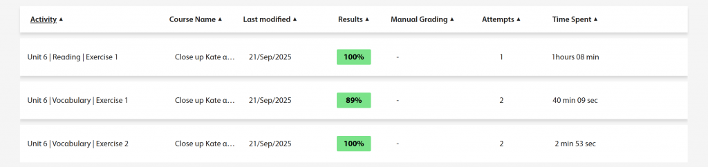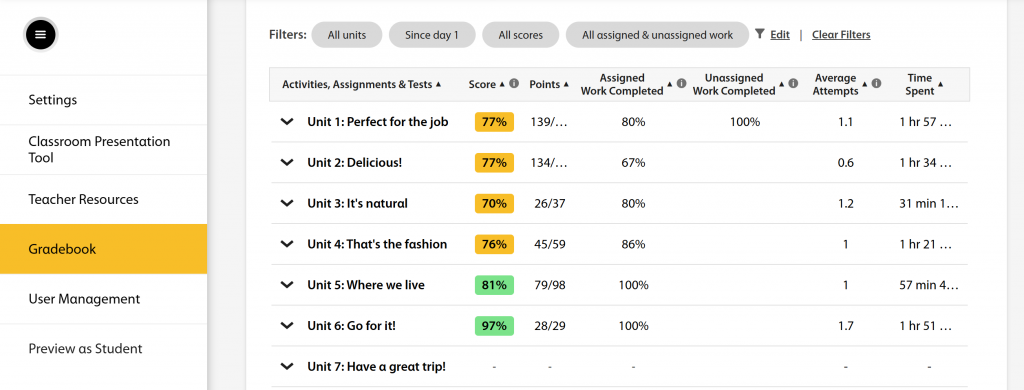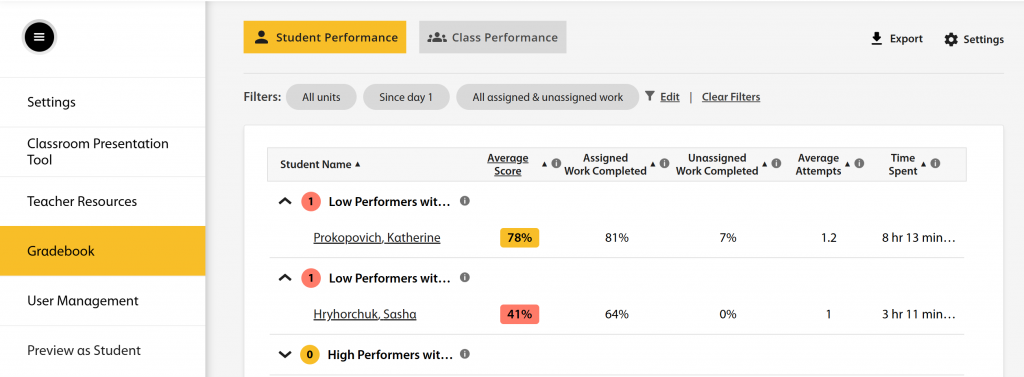 - Економити час. Замість ручної перевірки зошитів і фіксації прогресу кожного учня, викладач може скористатися цією платформою, яка автоматично виконає всю роботу та внесе звітність до електронного журналу (Gradebook). За потреби зі звіту можна будь-коли завантажити статистику у друкованому форматі.